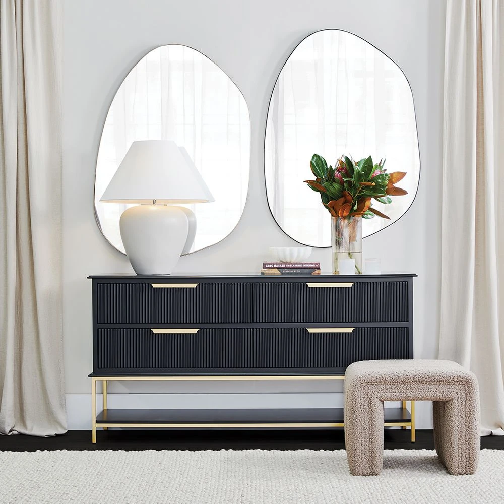 Inject organic elegance into your interiors with the Pollock wall mirror. Available in two sizes and colour finishes, the small measures 86 x 120cm and can be hung either vertically or horizontally. Finished in a chic black, this striking mirror softens spaces with its meandering oval frame adding a distinctly modern flair to the interiors it inhabits. Also available in antique gold.