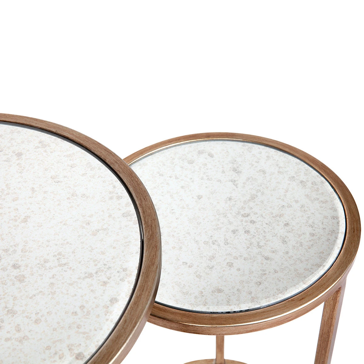 This beautifully adaptable nest of two side table set has been finished with a subtle antique gold finished frame and inlaid antique mirror tabletops. The fantastic nesting ability allows for a practical and versatile living piece.