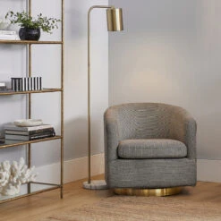 The Snapper Floor Lamp is made from brushed brass that shines and contrasts beautifully with the round white marble base. It would fit well in a Art Deco, Industrial or Modern Minimalists themed space. The metal shade angled to project a crisper glow.