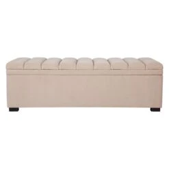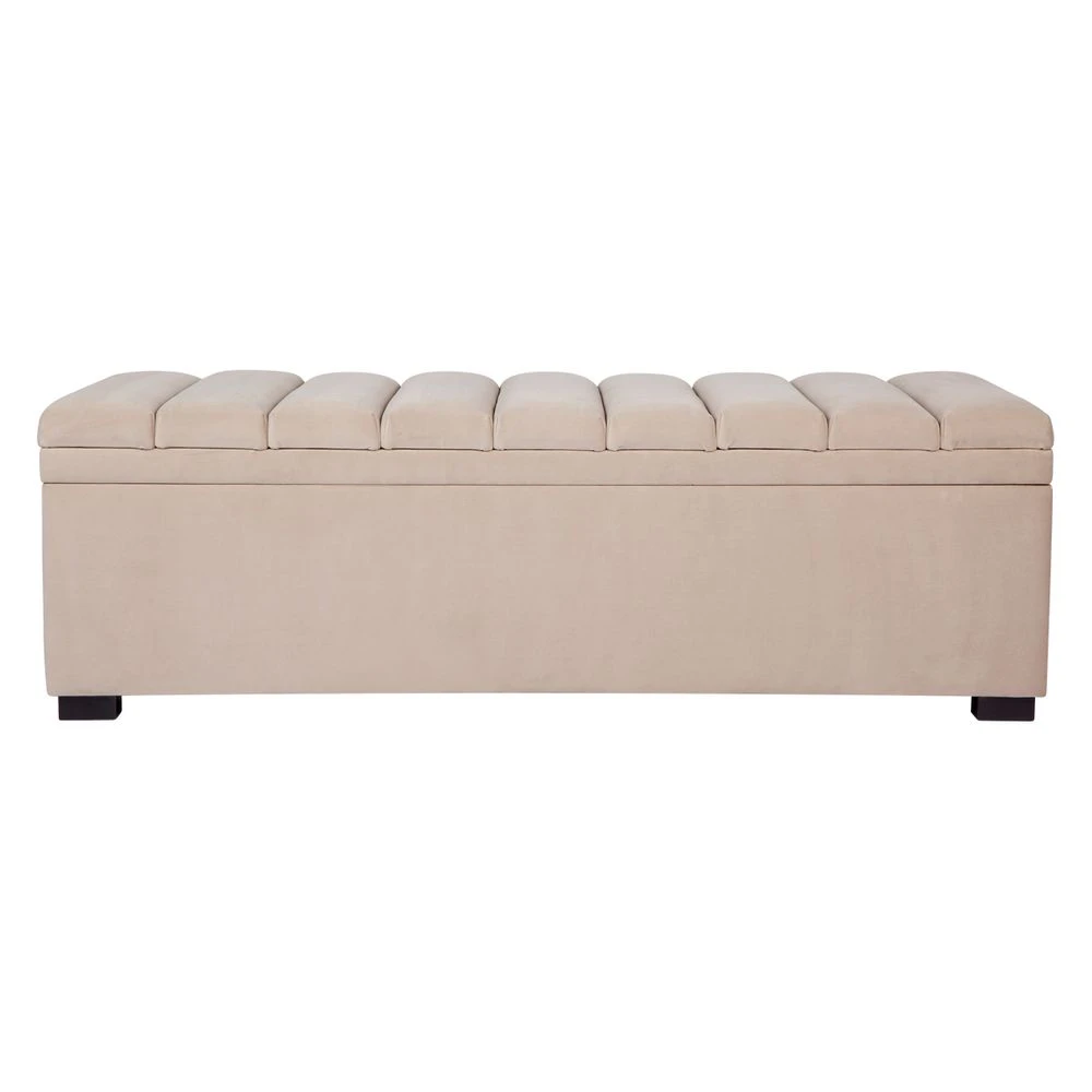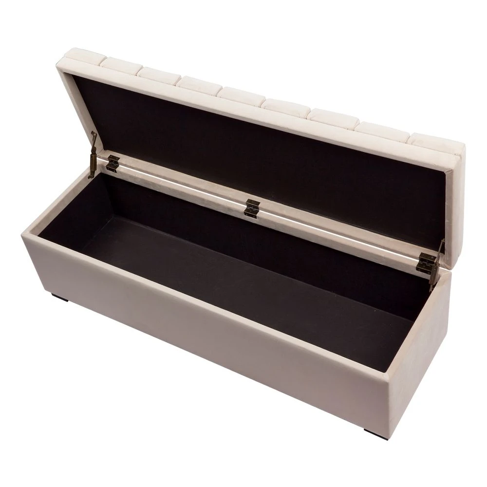 Introducing the Soho Storage Bench Ottoman in a stunning nude velvet finish. This luxurious piece features a panelled top that lifts to reveal ample storage space, making it both beautiful and functional. Its classic contemporary design makes it the perfect accent piece for any elegantly styled bedroom, entryway, or living room. Add a touch of sophistication to your interior with this beautiful storage bench ottoman.