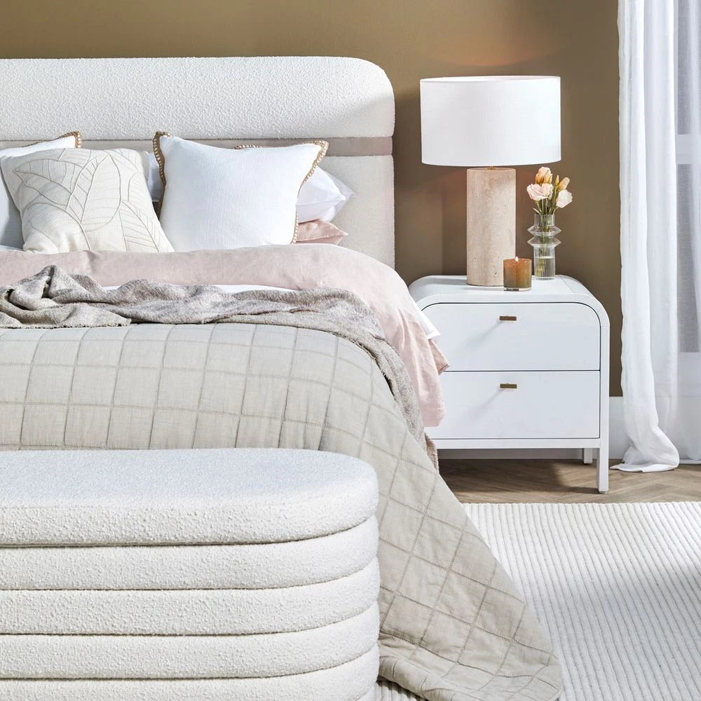 Refresh any bedroom with the luxurious Curve queen bedhead. Expertly upholstered on both sides in a plush white bouclé with a subtle velvet panel detail, The Curve queen bedhead is both discrete and refined. Providing a premium look with added comfort and support while reading or watching TV, The Curve queen bedhead enjoys a thicker construction than most at 22cm thick. The quality timber frame is enveloped in generous foam padding with tailored upholstery extending all the way to the floor. Also available in a delicious Latte toned shearling, The Curve queen bedhead has been designed to complement both contemporary and classic interiors with its subtle curves, natural tones and timeless style.