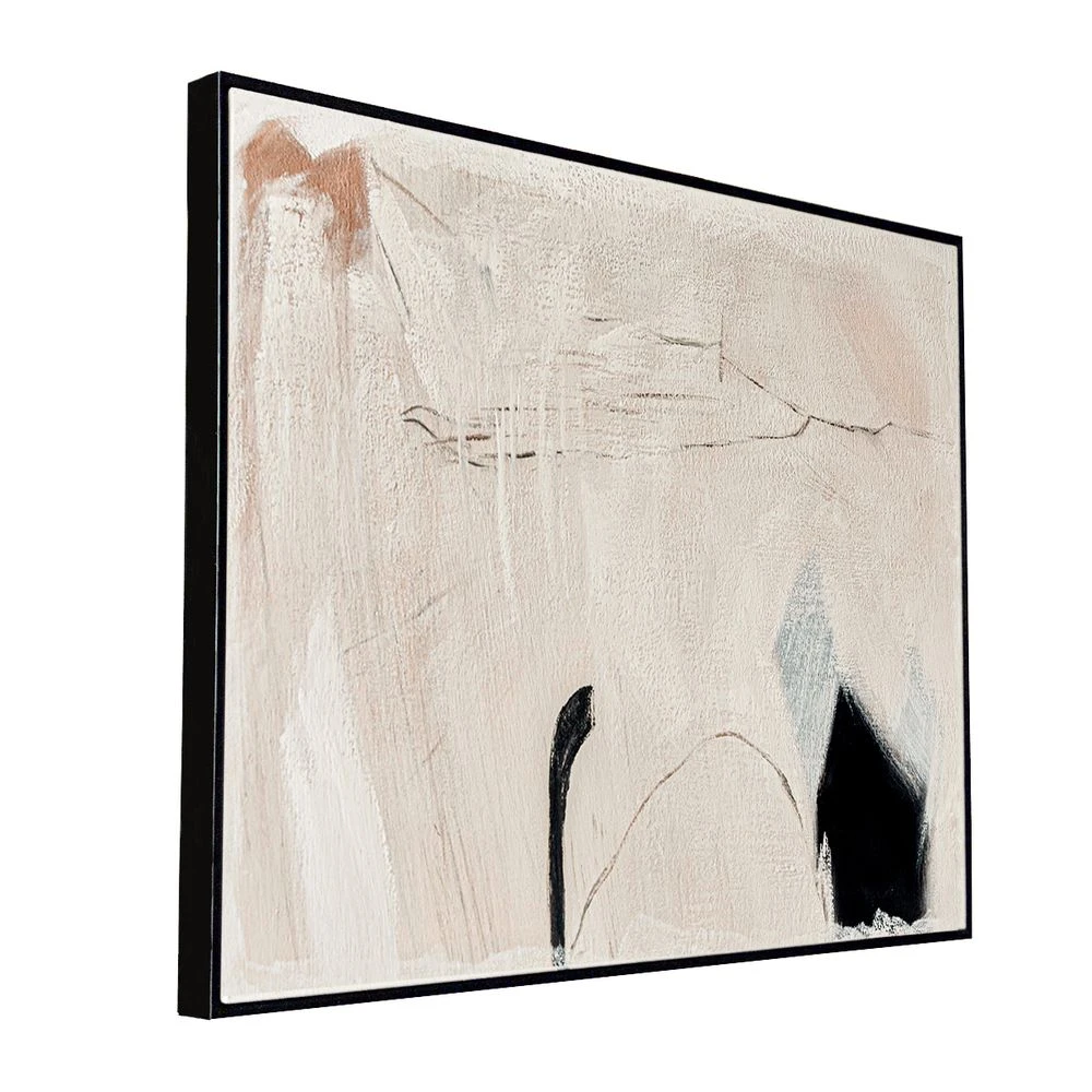 Tonal Retreat oil on canvas painting in medium – 80 x 100cm – is a temperate abstract that entices with its subtle hues and gentle composition. A delicate layering of tone and texture are created through a mix of peachy undertones awash with a blizzard of white, while moments of midnight blue and whimsical black line work add interest and contrast. Framed in a contrasting matte black shadow box frame, Tonal Retreat oil on canvas provides a contemporary statement that slips seamlessly into any interior scheme. Also available large (120 x 140cm).