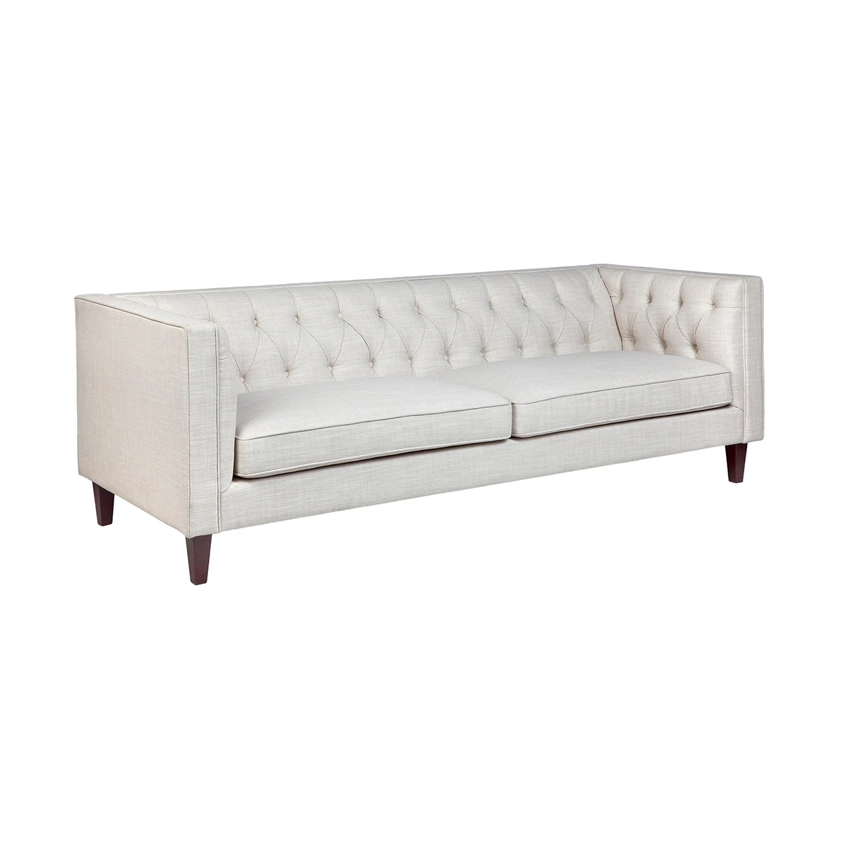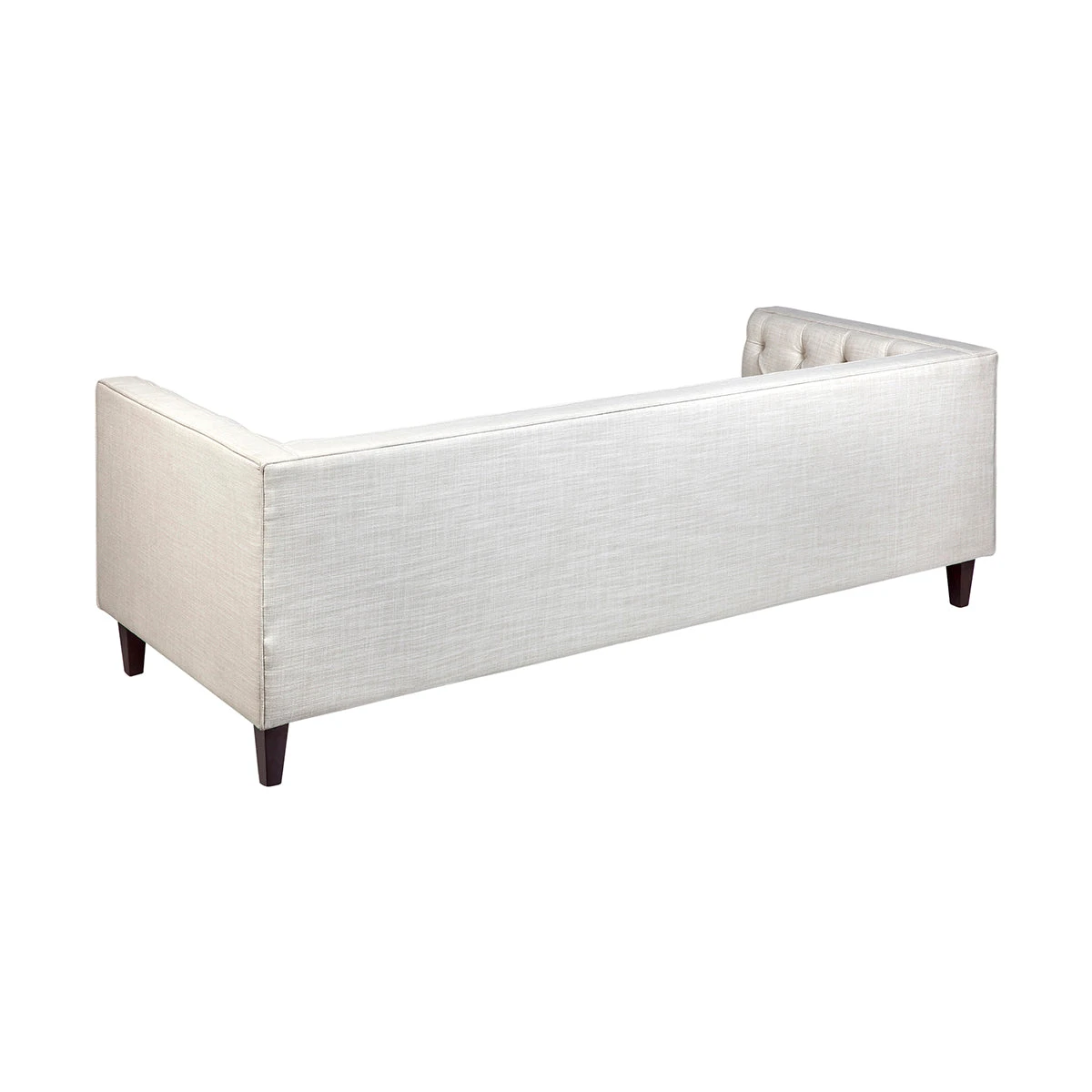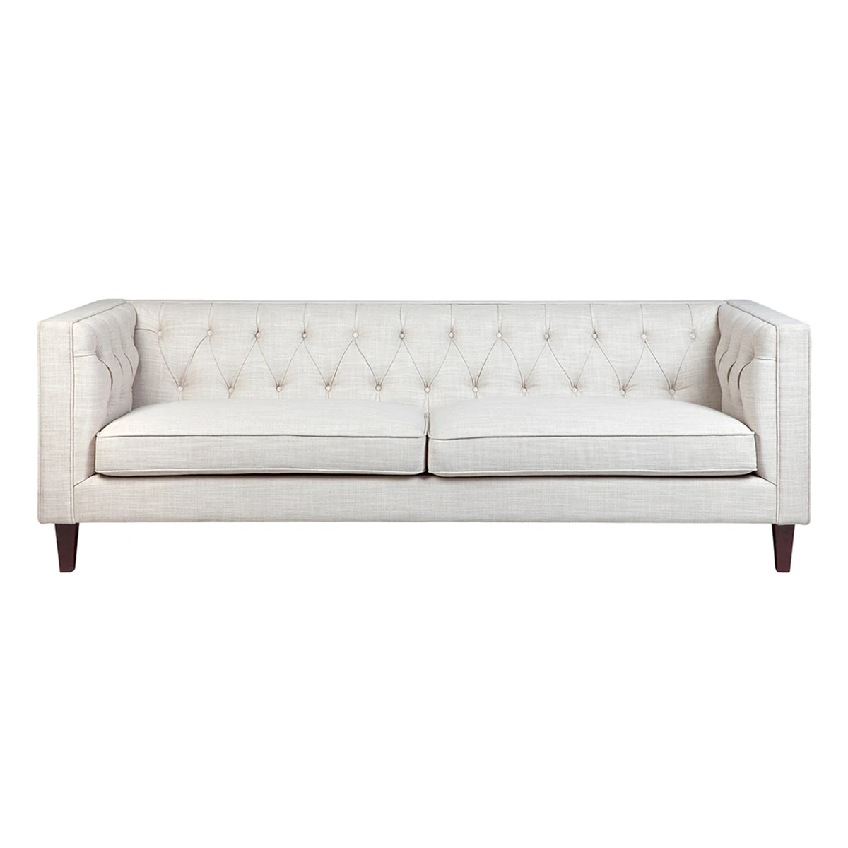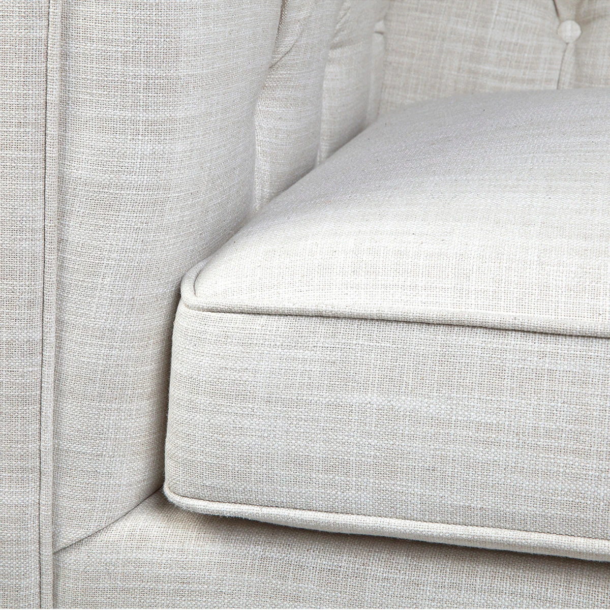 The Tuxedo 3 seater tufted sofa flaunts divine design. Exquisitely upholstered with a beautiful button-tufted backrest and detailed piping in an elegant natural linen blend fabric, the Tuxedo sofa features a feather and foam fill cushion for maximum comfort. The simple lines and black timber legs work in charming contrast to the light, detailed upholstery creating a timelessly sophisticated sofa that is the ultimate in classic contemporary design. Co-ordinate with the matching Tuxedo armchair or Tuxedo slipper chair for a truly stylish interior.