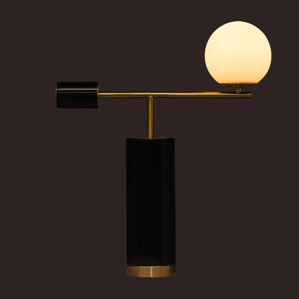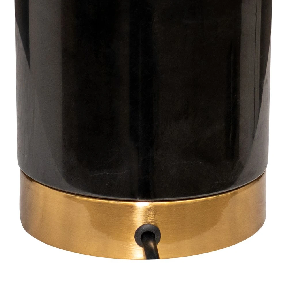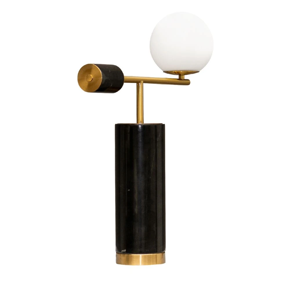 Dramatically striking, the Zamora Marble Table Lamp exudes mid-century elegance. Polished black marble with white veining, contrasted against brass hues and a milky-hued orb, creates a gentle ambiance, casting warm and inviting light into the surrounding space. The orb is seamlessly integrated into the lamp`s design, appearing to float effortlessly atop the brass stem. Sleek and contemporary, Zamora`s geometric lines and luxurious marble make it a versatile addition to any modern interior. Whether placed on a bedside table, desk, or living room buffet. Also available in Travertine.