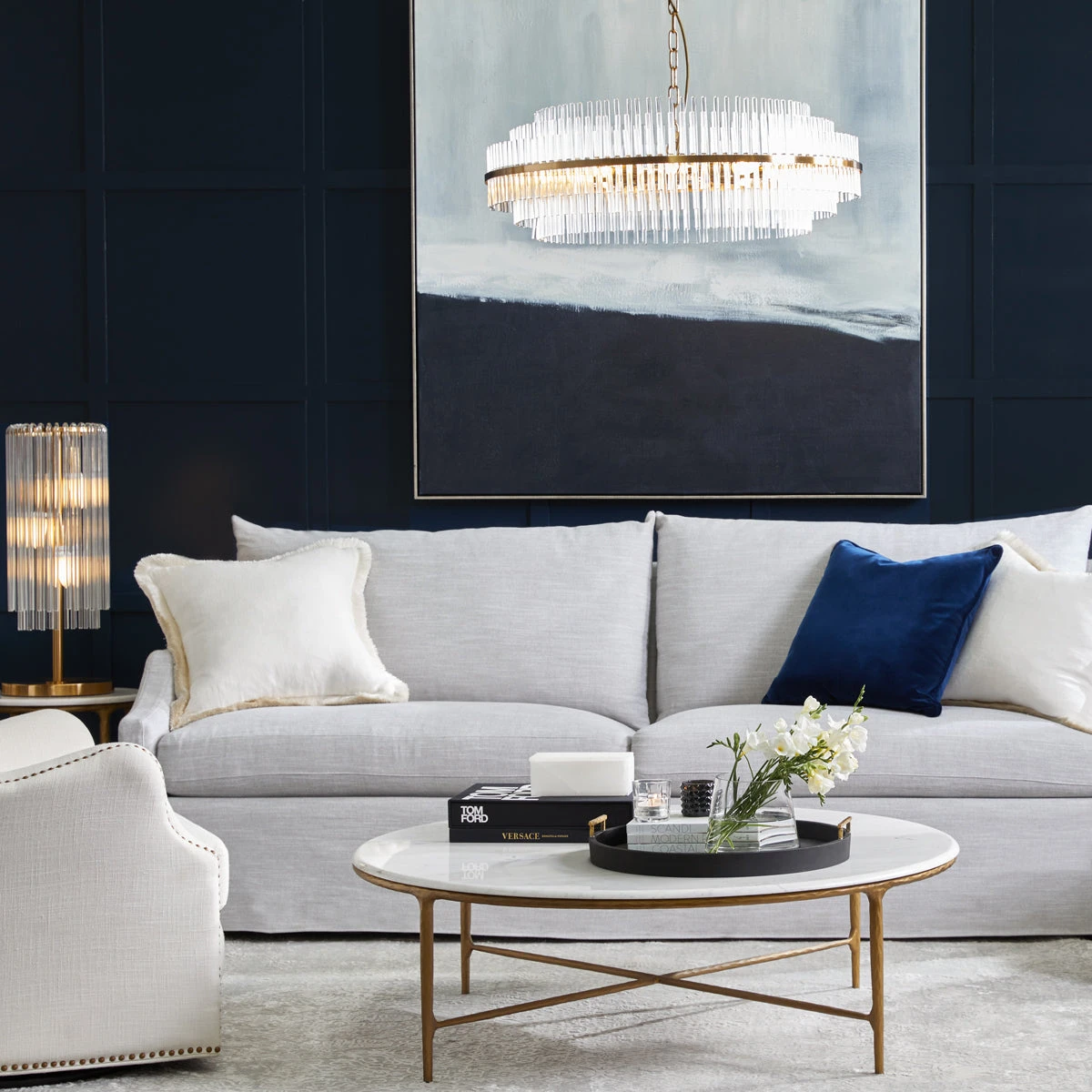 Simply spectacular, hand crafted crystal rods cascade effortlessly over a plated brass frame, hanging in modest harmony. A slender take on the popular Zara pendant, the Zara table lamp provides a delicate diffused glow as the play of light is reflected through its elegant crystal rods. Referencing the decadent Art Deco era, the Zara table lamp offers a modern interpretation of timeless glamour.